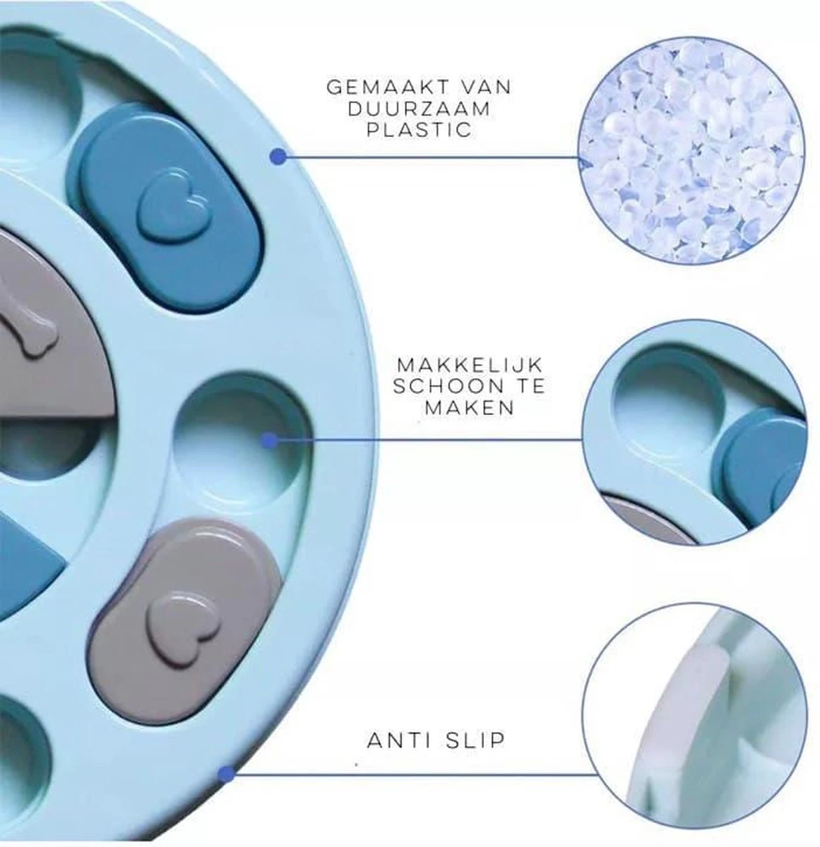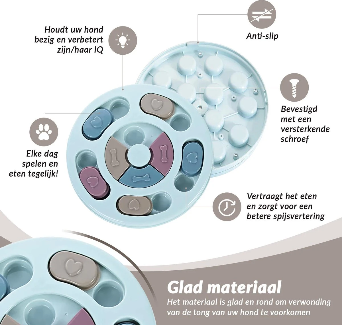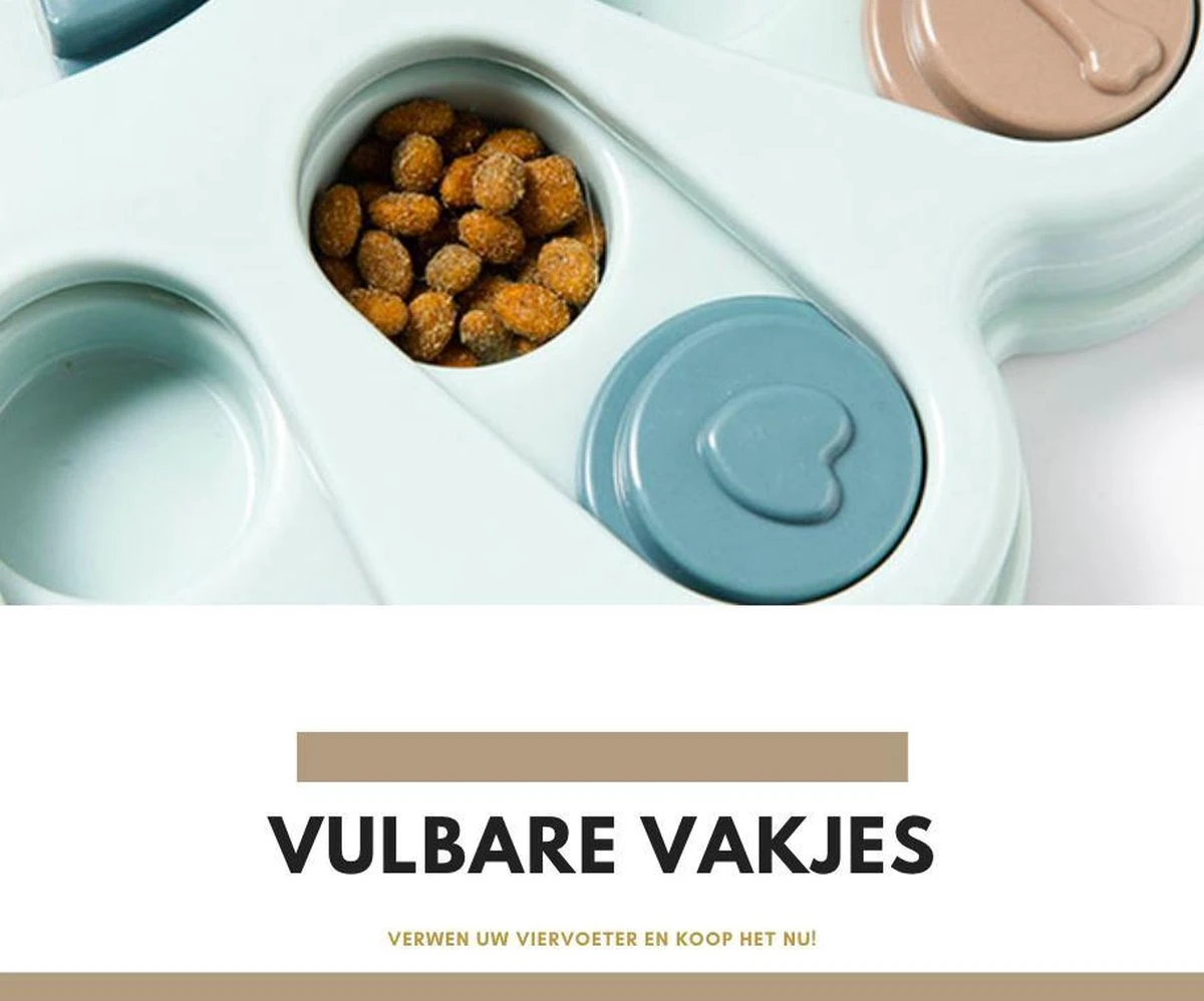 Niet alleen helpt het de intelligentie van uw hond te verhogen, het gaat ook nog eens verveling tegen. Door de knoppen opzij te kunnen schuiven wacht er een beloning en kunnen honden leren ze terwijl ze plezier maken. De hondenpuzzel beschikt over snack vakken en bewegende delen, die uw hond bezig kunnen houden om probleemoplossende vaardigheden te leren, maar ook om uw hond te laten werken voor zijn/haar voeding. Het is ideaal voor de dagelijkse bezigheid maar het voorkomt ook: verstikking, zwaarlijvigheid, winderigheid, overmatig eten en spijsverteringsstoornissen.