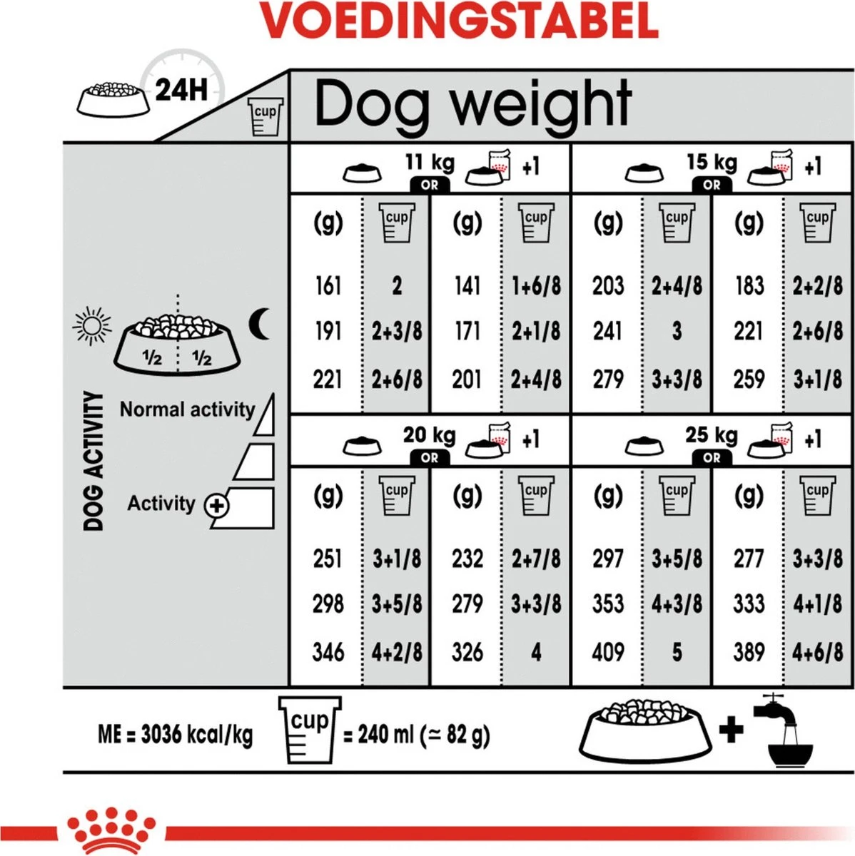 Voor gewichtscontrole van volwassen middelgrote honden Voor honden vanaf 12 maanden tot 7 jaar met een volwassen gewicht van 10kg tot 25kgVerschillende factoren, zoals weinig of onvoldoende beweging, slechte voedingsgewoonten, sterilisatie of genetische aanleg kunnen zorgen voor een gewichtstoename bij middelgrote honden. Dit probleem moet niet onderschat worden, want het kan gezondheidsproblemen en zelfs een kortere levensverwachting tot gevolg hebben. Een hond met overgewicht moet een voeding met een lager vetgehalte krijgen en de hoeveelheid voeding moet worden aangepast.CALORIES REDUCTION: Stimuleert gewichtsverliesMedium Light zorgt ervoor dat uw hond 18%* minder energie binnen krijgt met dezelfde hoeveelheid voeding. Medium Light bevat een verhoogde eiwitgehalte (27%) dat zorgt voor een behoud van de spiermassa. Medium Light bevat de stof L-carnitine dit stimuleert de vetverbranding van uw hond.*vergeleken met een onderhoudsvoeding – Studie Royal Canin 2006.